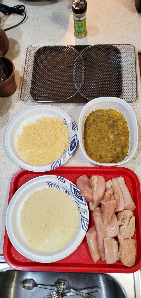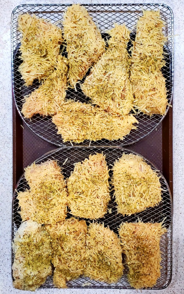 Start by placing your chicken in the almond flour and coat all sides. Dip into your egg, let excess drip off. Place on your parmesan and coat all sides of the chicken. Place on your air fryer rack. Repeat until all of your chicken is battered. Then hit them with a little more seasoning.