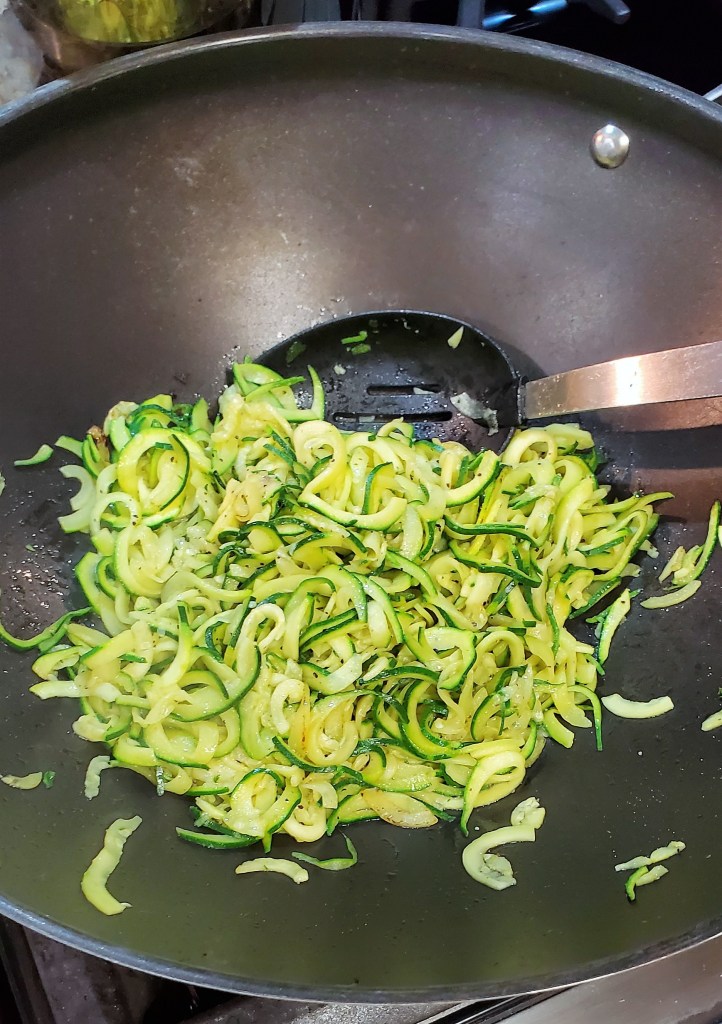 While your chicken is cooking, get your zucchini and zoodle them. Choose whichever size blade you want your noodles. We used the fettuccine blade tonight. We use this one found on Amazon –>> https://amzn.to/3ixq1DB