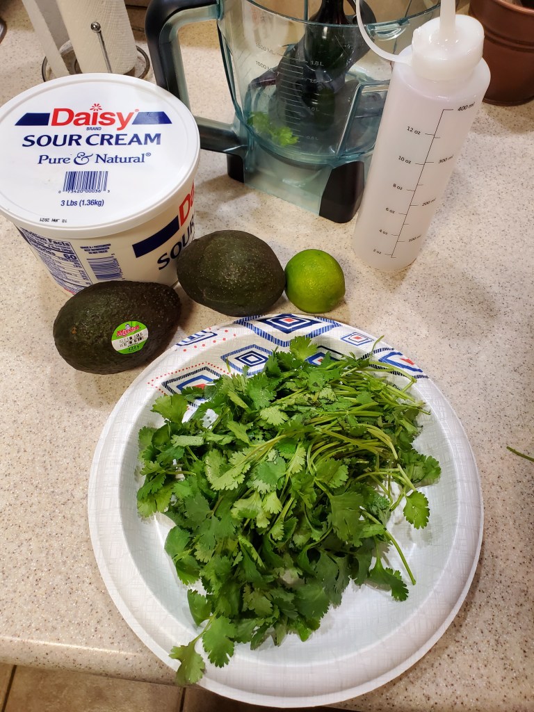 Get your food processor out. Throw in 2 peeled avocados, the cilantro, 1 fresh squeezed lime juice, water and all of your seasonings. Put on blend and let run for 20 to 30 seconds. Remove the lid and give it a scrape down the sides and hit it again for another 15 seconds. If you put some on a spoon and it doesn’t slide off, you can add a bit more water. This will help when using as a dressing. Transfer to a squeezable condiment container or bowl and refrigerate.