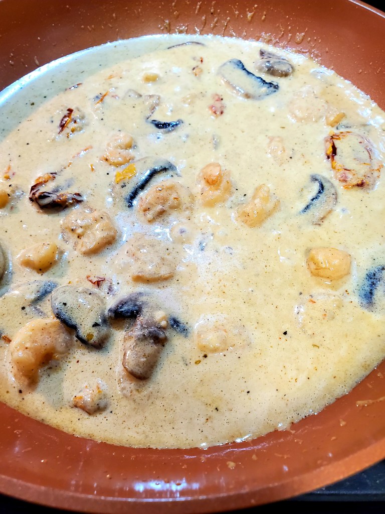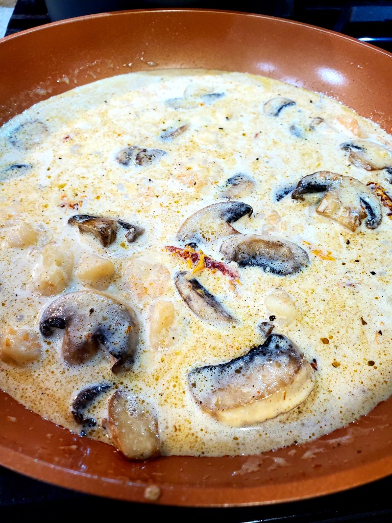 Now lets get the sauce simmering. It takes it a bit to thicken so we will make it and then cook the fish. In a fairly large frying pan, add your 4tbs butter, 2tsp minced garlic and your sun dried tomato’s. Cook on high heat for about 30 seconds, being careful to not burn the garlic or the butter.