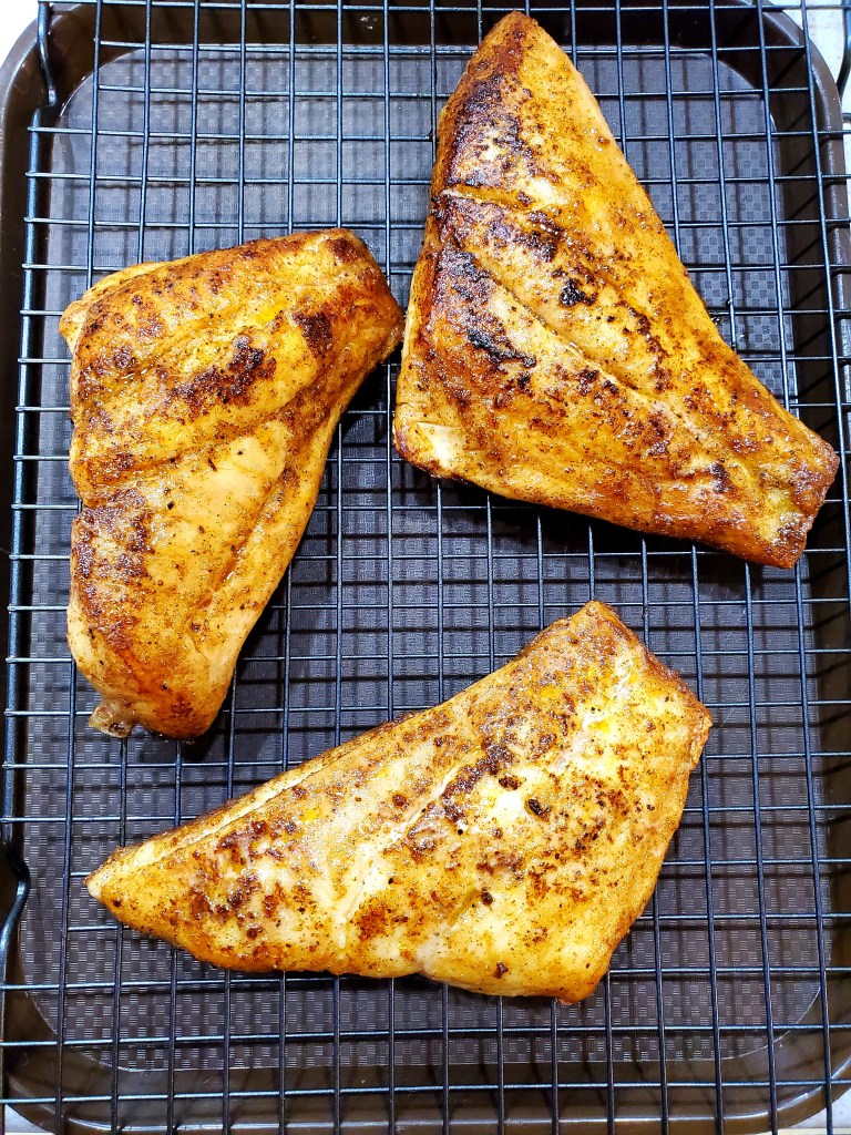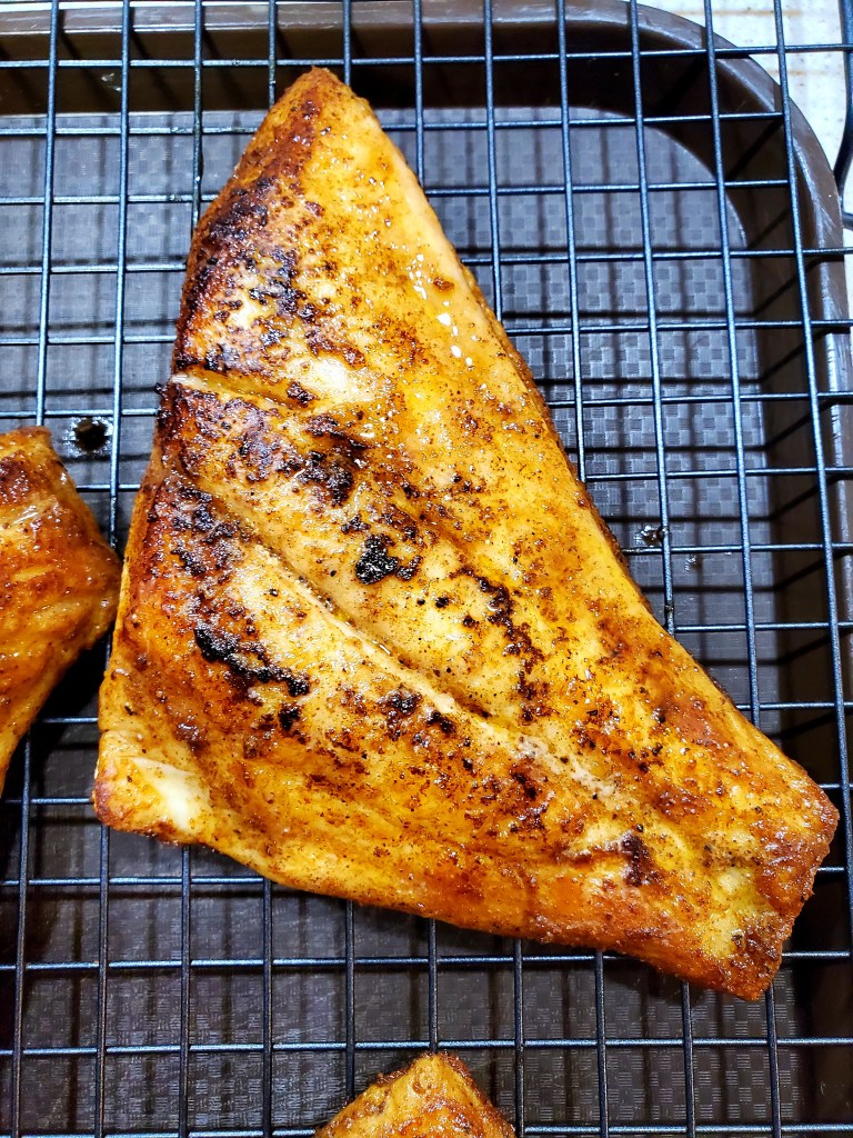 Now let’s blacken that Snapper. On a frying pan, or cast iron, heat the pan on high for several minutes. Add a little bit of avocado oil to the pan. You want the pan screaming hot to get that good blackened char. When your pan is ready, place your fish in and let it cook on each side for about 3 minutes. I had some leftover melted butter that I poured over the top. I suggest you do the same. Don’t worry, it’s supposed to be a little charred looking. When done cooking, remove from pan and place on a rack to rest for a few minutes.