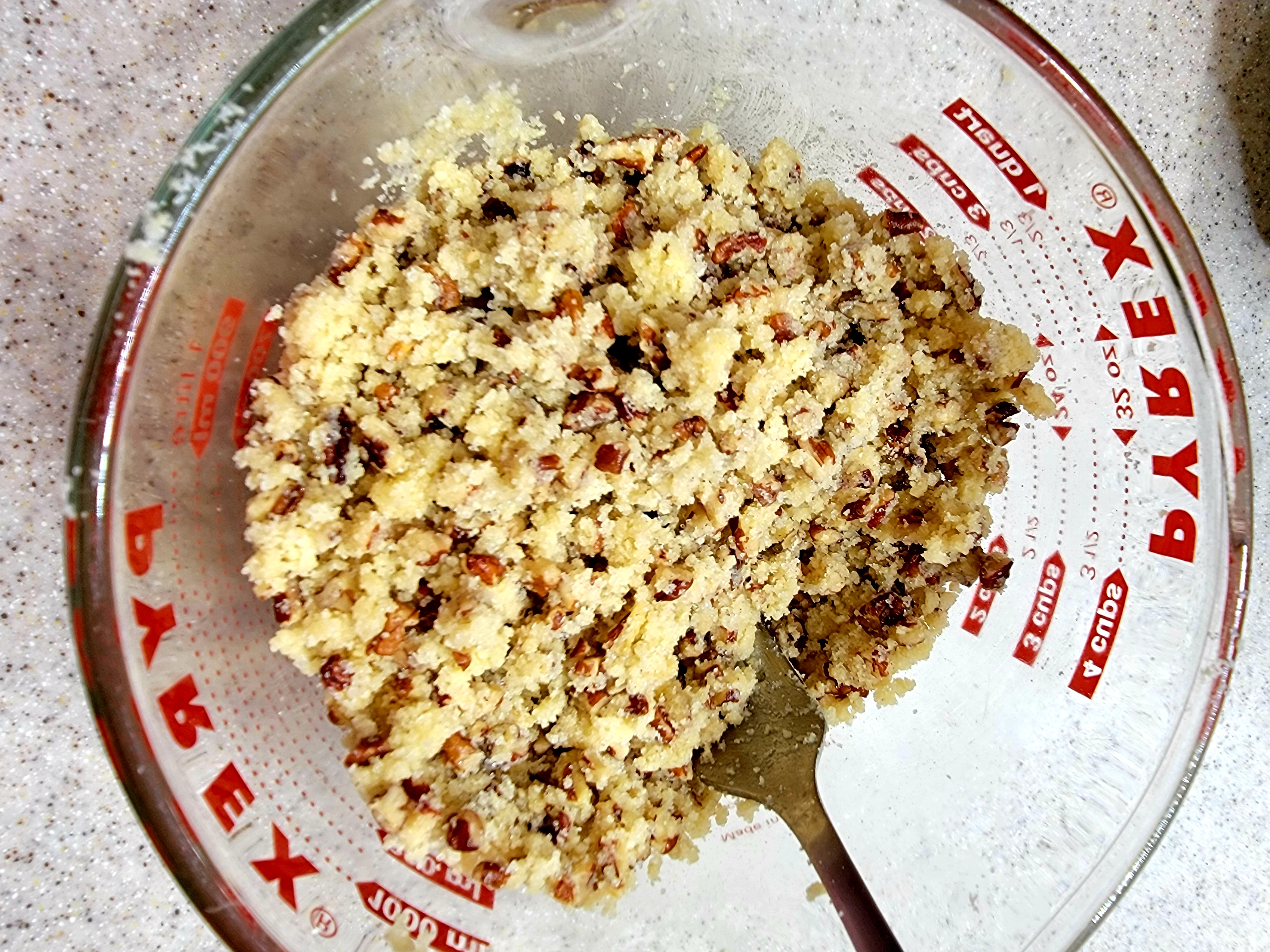 We will first prepare the crust. Preheat your oven to 375. While preheating the oven, in a large bowl put all your crust ingredients into a bowl and mix well. This will be a crumbley mixture.
