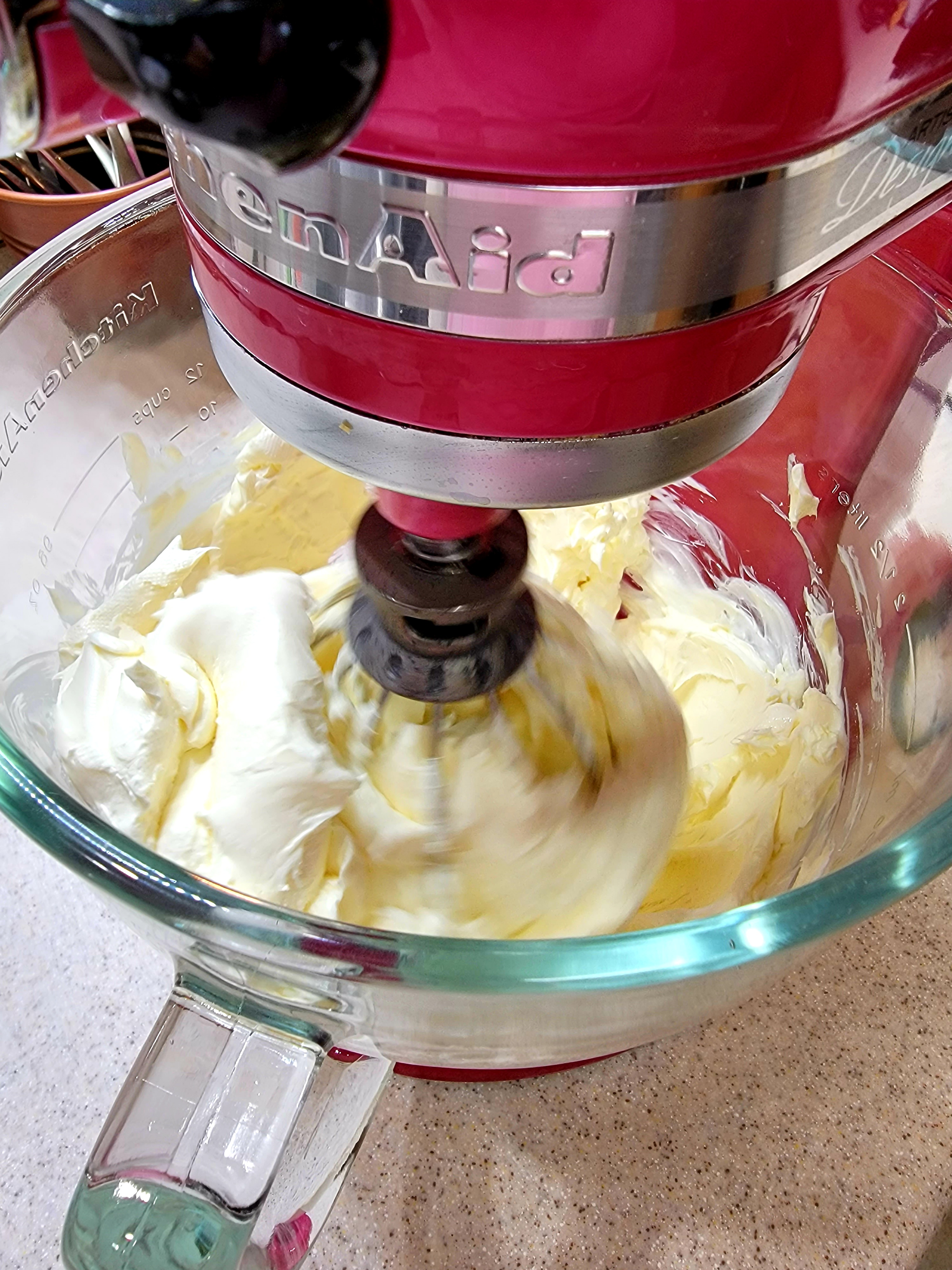 Now, while the crust is cooking, we will prepare the filling. In a large mixer, beat your 5 blocks of cream cheese until fluffy.