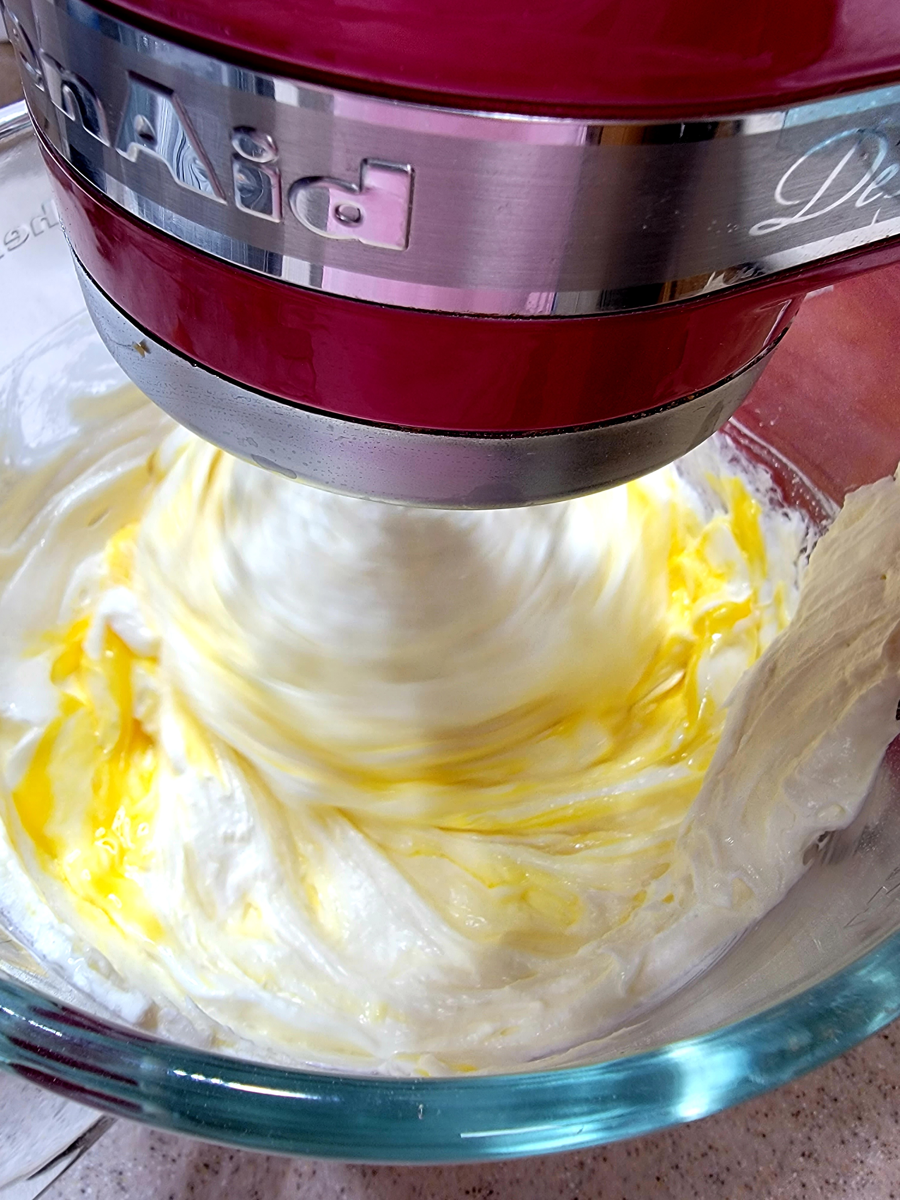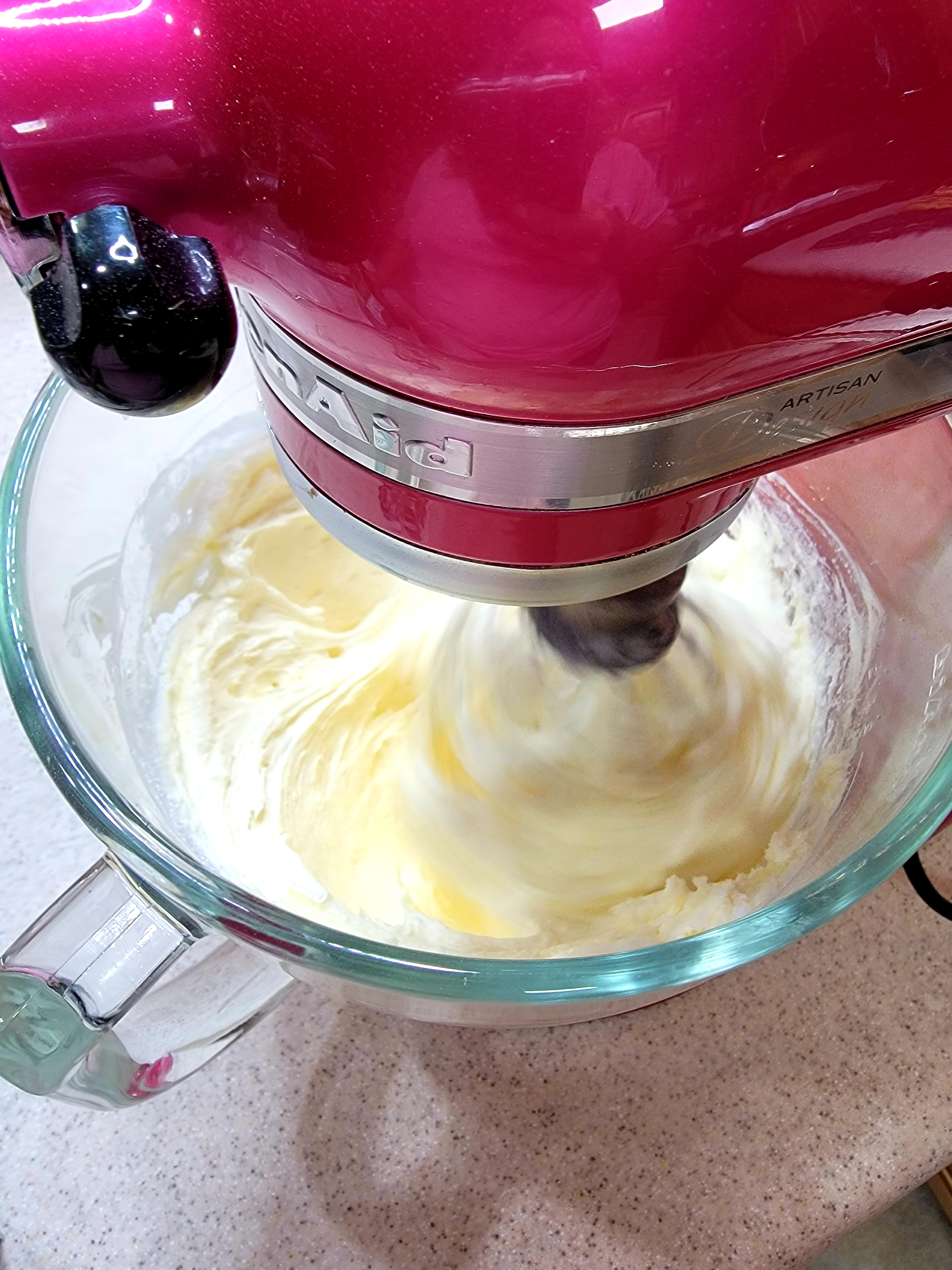 Once your mixture is fluffy, gradually pour the 1.5 cups of keto sweetener into the mixture. Add in 1 egg at a time, scrape down the bowl after each.