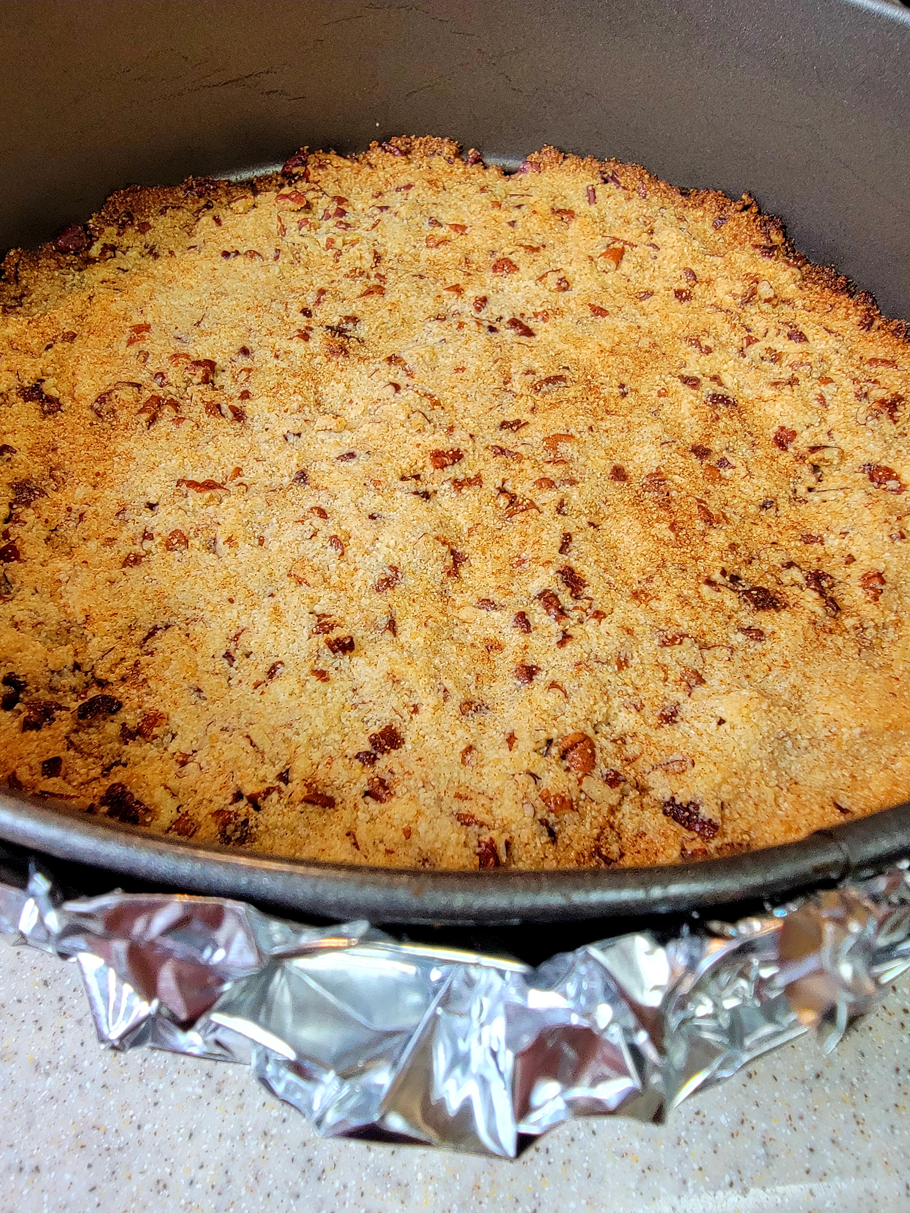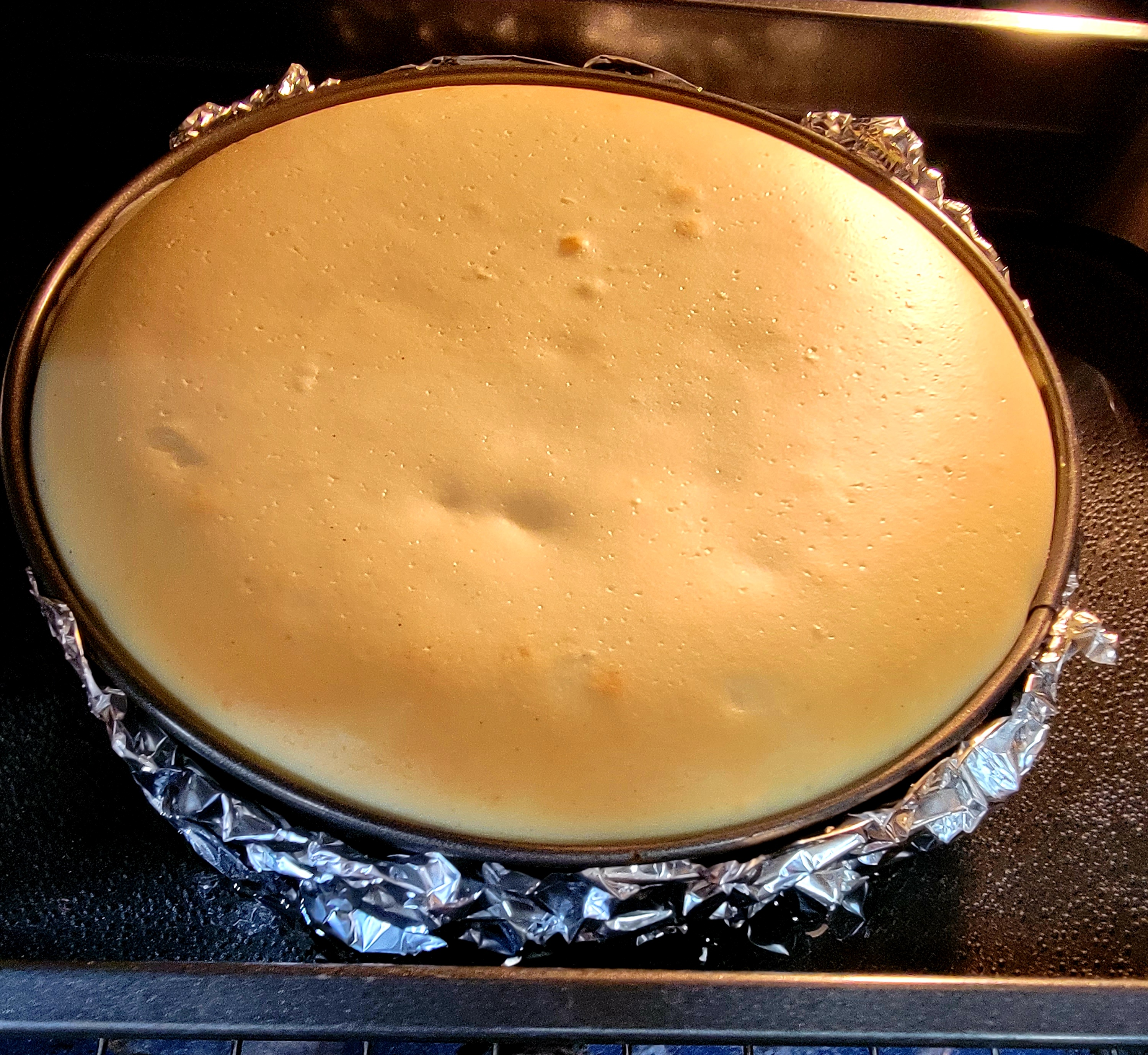 After the crust has completely cooled and your filling is completely mixed, you need to wrap the springform pan with foil to protect it from the water bath.