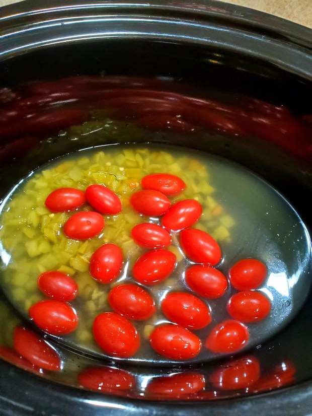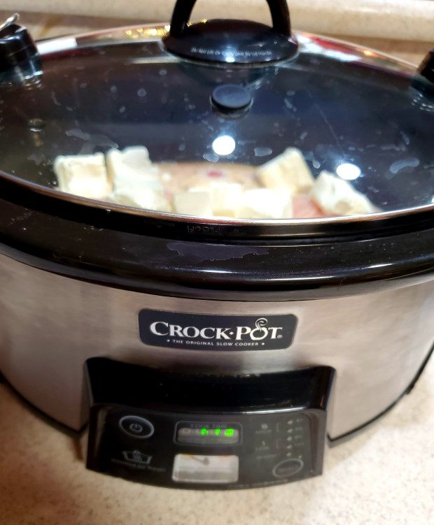 In your crock pot, add all of your ingredients. There’s no need to mix or stir at all.