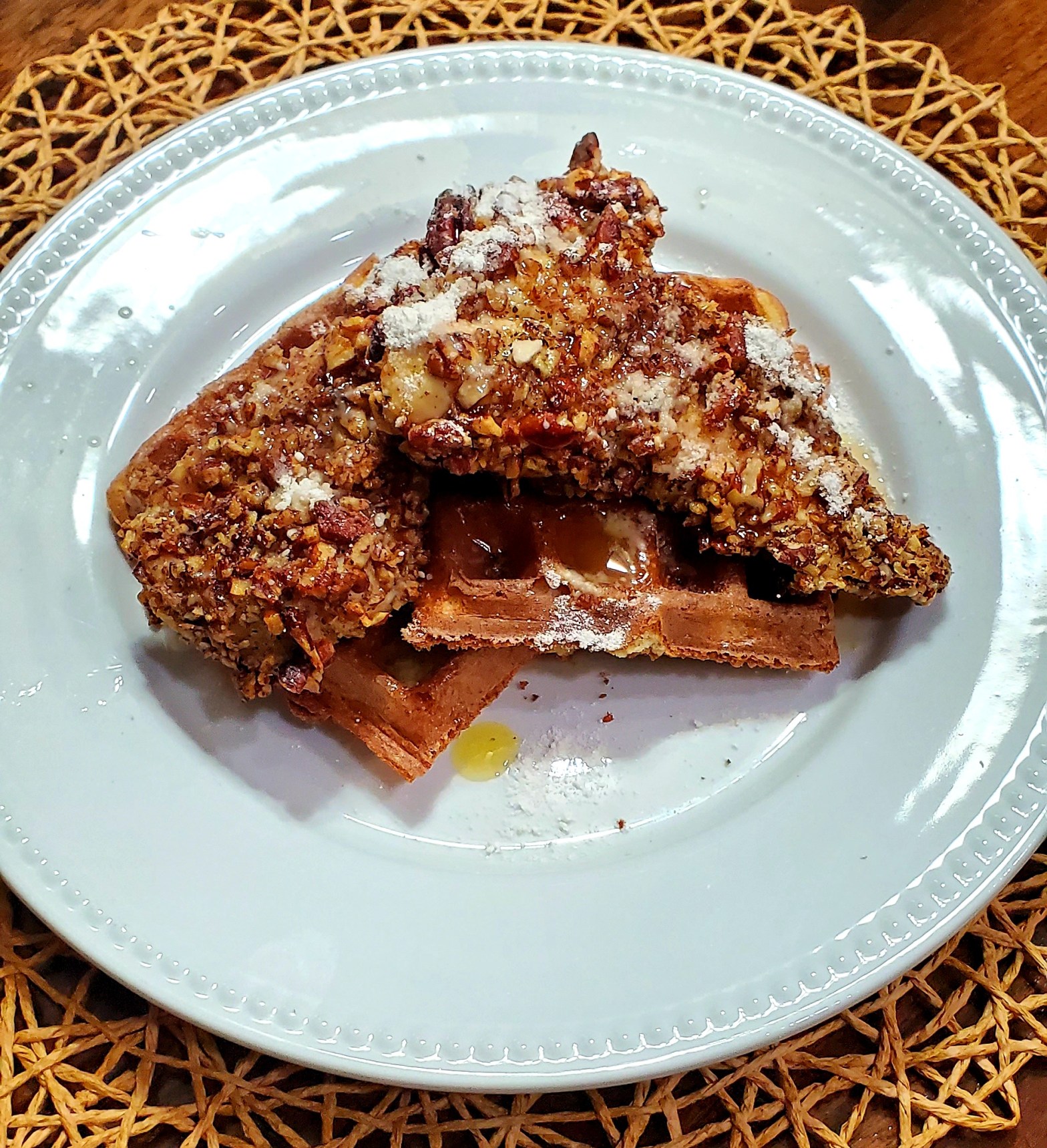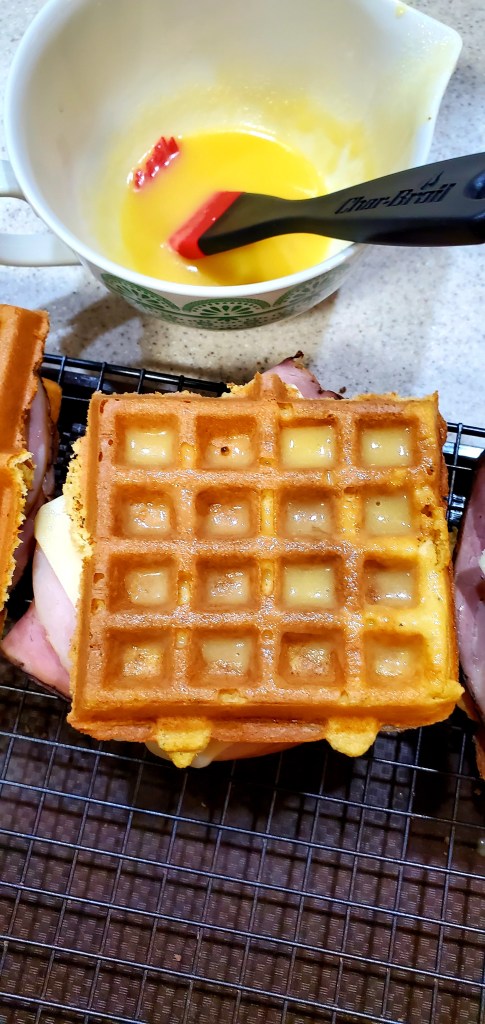 Add your meat/cheese to one side of the chaffle and place the other half on top. In a small bowl, add your egg, vanilla, cinnamon, and 1 tbs of melted butter. Using a brush, brush your egg/butter mixture on the top of the chaffle or dip them in a shallow bowl.
