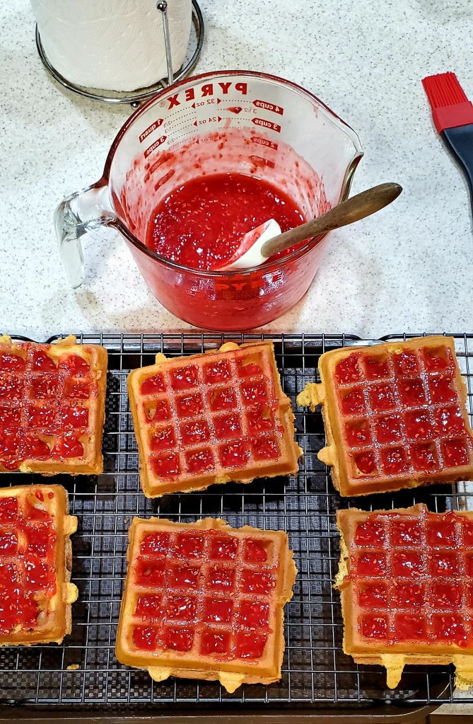 On only 1 side of each chaffle, spread the raspberry jam evenly. You should go light here as the more you add, the more carbs you are getting.