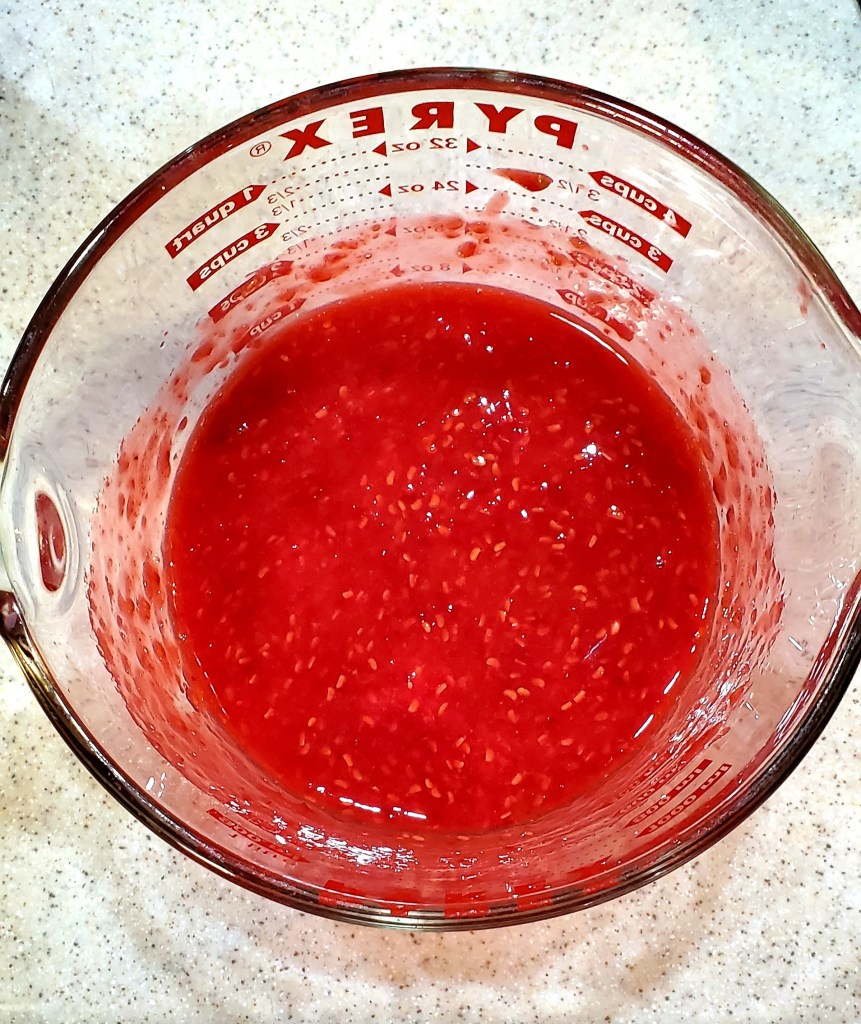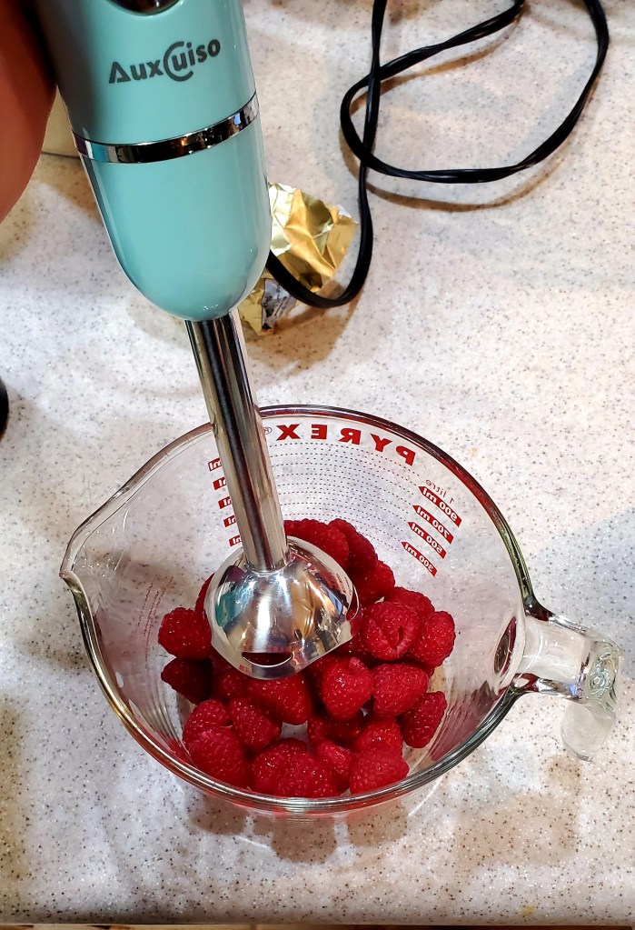 Place your raspberries in a mixing bowl. Using an immersion blender, blend the raspberries until they are smooth. I bought my immersion blender on Amazon and very happy with it: https://amzn.to/3gGySCn