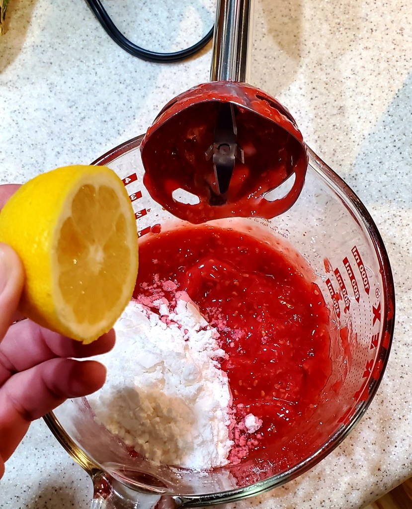 Once your raspberries blended, add the Keto approved powdered sweetener and lemon juice and mix. Place in fridge.