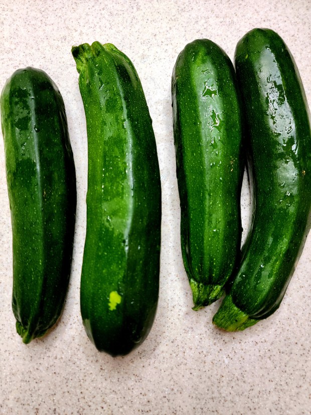 We need to start out by washing our zucchini and then cutting the tip off of both ends, but just the tip! Once this is done, cut them down the center as straight as you can.