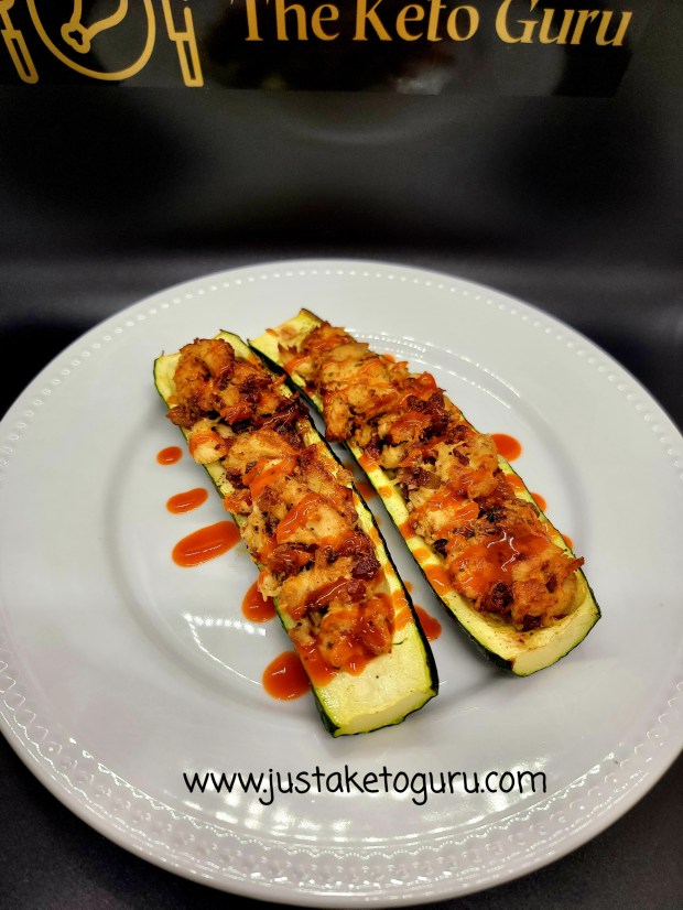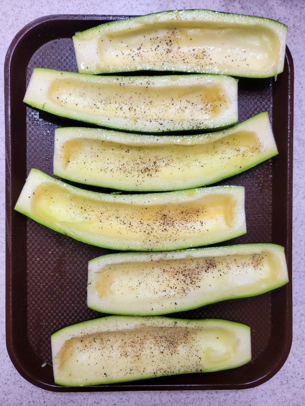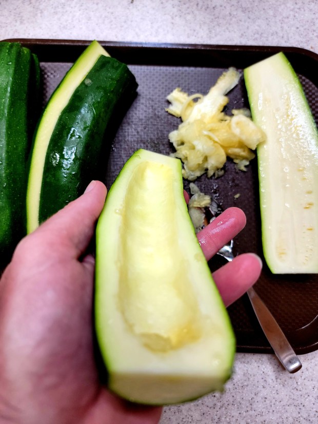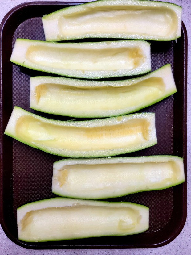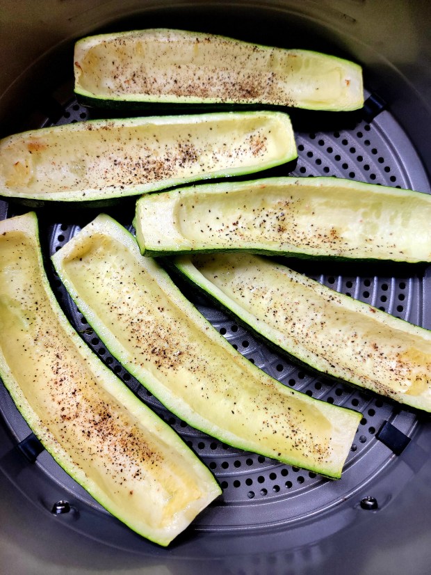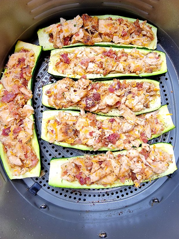 At this point, everything should be ready to stuff. Take your zucchini out of the air fryer. Using a spoon, start adding your filling into your boats. Fill each one and pack them down real good. This helps prevent them from falling out. Repeat until they are all stuffed. Just for reference, 1lb. of ground beef perfectly stuffed 6 boats.