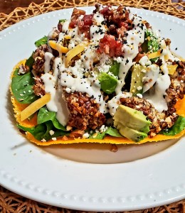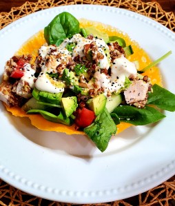 You know how you go to a Mexican restaurant and order that big, greasy, crunchy taco shell salad full of carbs? Well now you can make your own at home guilt free with only 1 net carb per shell! These Folio wraps are pretty diverse and can serve multiple purposes including taco salad shells. Just a quick trip into the microwave and something round to form it and you have a homemade Mexican restaurant in your Keto Kitchen!